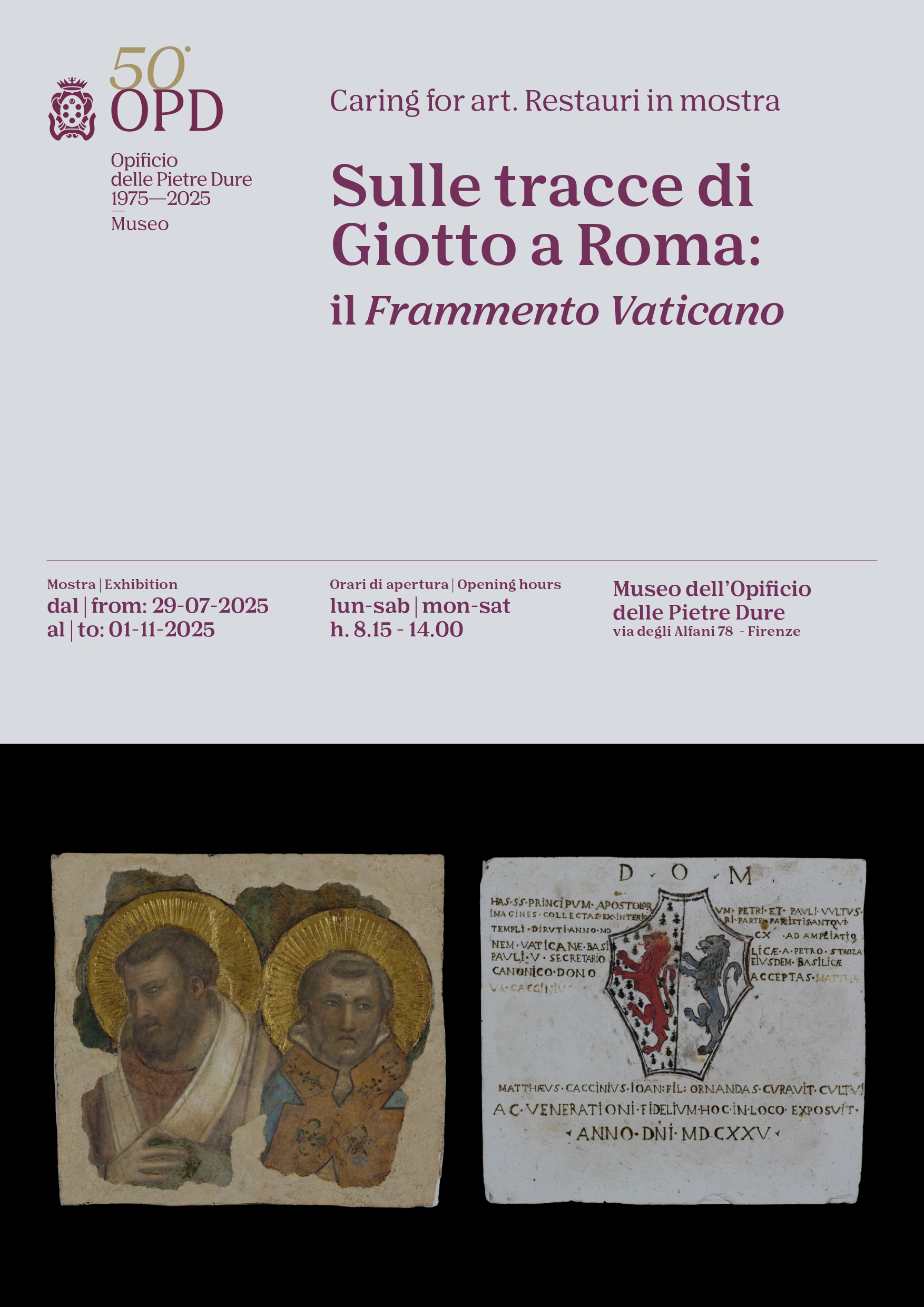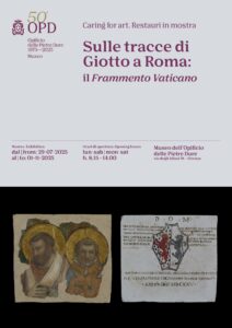 Dal 29 luglio al 1 novembre 2025 il Museo dell’Opificio delle Pietre Dure di Firenze accoglierà, nell’ambito del ciclo “Caring for Art. Restauri in mostra”, un ospite di importanza straordinaria per il mondo dell’arte e della ricerca: il cosiddetto Frammento Vaticano, unico resto del ciclo di pitture murali che Giotto e la sua équipe realizzarono nel primo quarto del XIV secolo nell’antica Basilica di San Pietro in Vaticano. Un’opera di eccezionale valore storico e artistico, ora godibile pienamente dopo un complesso intervento di restauro condotto dall’Opificio delle Pietre Dure tra il 2016 e il 2019.