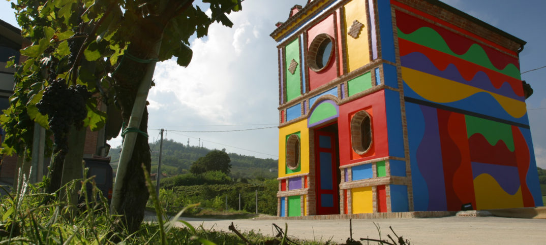 Nelle splendide Langhe piemontesi, in una delle zone di maggiore produzione di Barolo DOCG, la Cappella della Madonna delle Grazie, conosciuta come Cappella delle Brunate o Cappella del Barolo, costruita nel 1914 in prossimità di un santuario esistente, nasce come luogo di preghiera e di riparo per gli agricoltori che lavoravano nei vigneti circostanti. Se l’esterno è molto semplice, denunciando una struttura ad aula unica terminante con un’abside semicircolare, l’interno non riservava particolari sorprese, con i suoi affreschi privi di interesse di un artista locale. Nell’intento di potenziare gli aspetti simbolici dell’architettura, la famiglia Ceretto acquista nel 1976 l’edificio insieme ad alcuni ettari di vigneti, si rivolge all’artista inglese David Tremlett, che coinvolge a sua volta il suo amico americano Sol LeWitt, in modo che se il primo si occupa dell’interno, il secondo interviene invece sugli esterni. Se Tremlett si propone di creare qualcosa che favorisca alle persone di trascorrere una giornata piacevole, sedendosi, bevendo un bicchiere di vino, leggendo un libro, parlando o pregando, Sol LeWitt, con i suoi esterni ricoperti da colori brillanti, vuole captare l’attenzione, attirare lo sguardo. Grazie agli interventi dei due artisti, la piccola architettura, che si staglia in maniera inconfondibile nel verde e ondeggiante paesaggio piemontese, si presenta trasfigurata, creando un estraniante rapporto dialettico con l’ambiente. I colori gioiosi e vivaci si mescolano con quelli della natura, in modo che la cappella diventa il perno visivo dello spazio circostante. Le foto sono per gentile concessione di Ceretto Aziende Vitivinicole. ©Tutti i Diritti Riservati. Fotografie di Stefania Spadoni, Maki Galimberti e Tino Gerbaldo. In un accostamento tra colori primari e complementari (blu, giallo, rosso, verde, viola), l’esterno prende vita nel gioco di forme ad andamento concavo e convesso nelle facciate laterali, nelle specchiature della facciata, che seguono il disegno geometrico delle lesene dell’architettura. Ci sentiamo immersi in una festa cromatica che gioca con l’azzurro del cielo, con la nebbia autunnale o con la neve invernale… Lo spettatore è invitato a circolare attorno all’edificio, come se fosse invitato a comprendere la logica combinatoria delle cromie calde e serene. Una croce gialla in una parete laterale denuncia la destinazione della cappella. L’edificio appare così trasfigurato, suggerendo che in quel luogo, in quegli spazi ci si può ritrovare nel tempo della gioia, della condivisione. Semplice gioco? Forse. Tuttavia, non è forse il gioco, unendo il rigore delle sue regole e la libera gratuità del tempo in cui si gioca, a costituire una dimensione più importante della vita? Anche nell’interno sono messe in atto affini caratteristiche percettive. L’architettura dipinta e le vetrate colorate appaiono realizzate nel desiderio di creare uno spazio di pace, di semplicità e di ospitalità. I colori del giallo, dell’azzurro, del rosso, degli ocra, accostati gli uni agli altri, si accendono e s’infiammano, dando vita a un contrappunto cromatico, come evocando una gioiosa danza di suoni. Le forme sono separate nell’aula da una linea bianca che crea una trama, una rete concepita nel desiderio di tessere inedite relazioni, connessioni segrete. Lo spazio della cappella si trasforma in luogo dell’accoglienza, della fraternità, potenziando in questo modo la destinazione originaria dell’edificio. È questo un bellissimo intervento su di un edificio pre-esistente, divenuto oggi luogo simbolico delle Langhe stesse, grazie a una inedita armonia tra natura e cultura. Andrea Dall’Asta Le foto sono per gentile concessione di Ceretto Aziende Vitivinicole. ©Tutti i Diritti Riservati. Fotografie di Stefania Spadoni, Maki Galimberti e Tino Gerbaldo.
